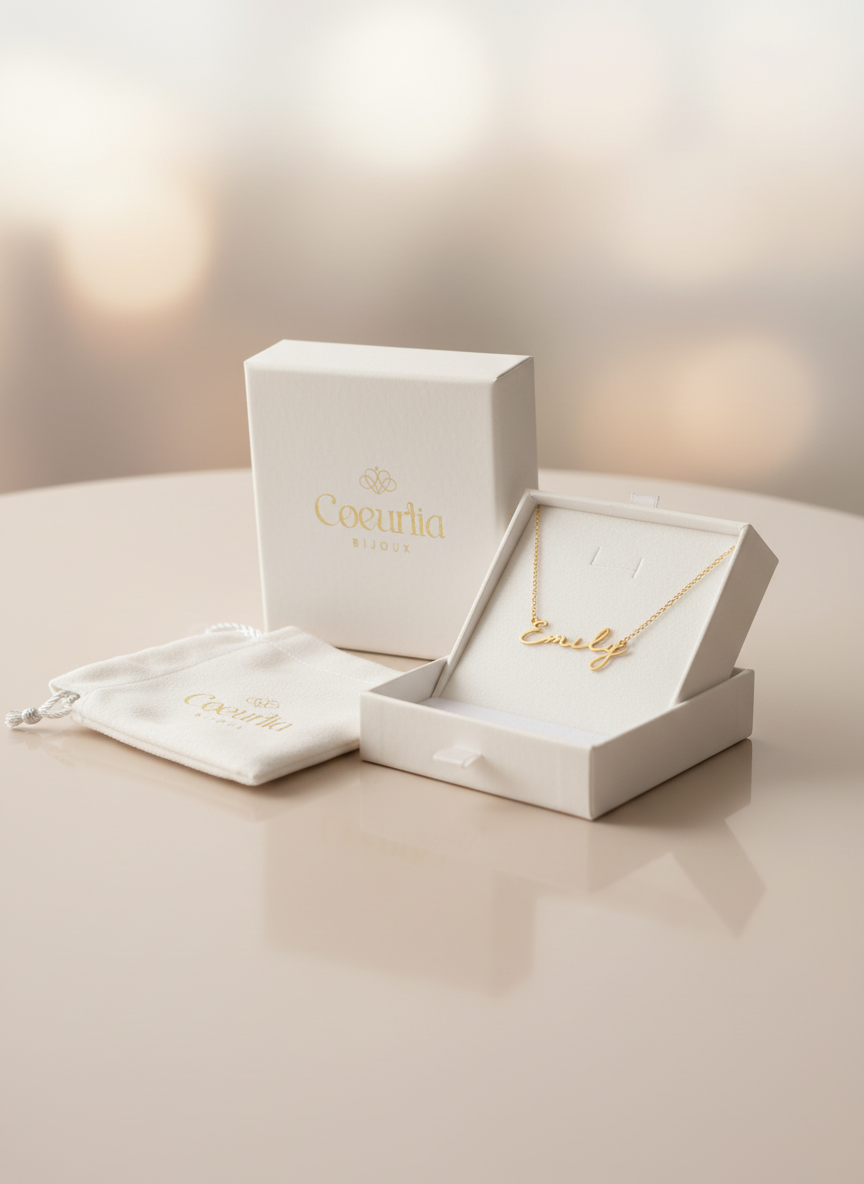 Chaque bijou Coeurlia est livré dans sa pochette en velours élégante.